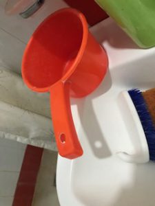 Nach oder vor dem großen Geschäft wird dieser mit Wasser gefüllt. Dieses (kalte!) Wasser gießt man nach der Verrichtung dann die Kimme entlang und mit der anderen Hand reinigt man.