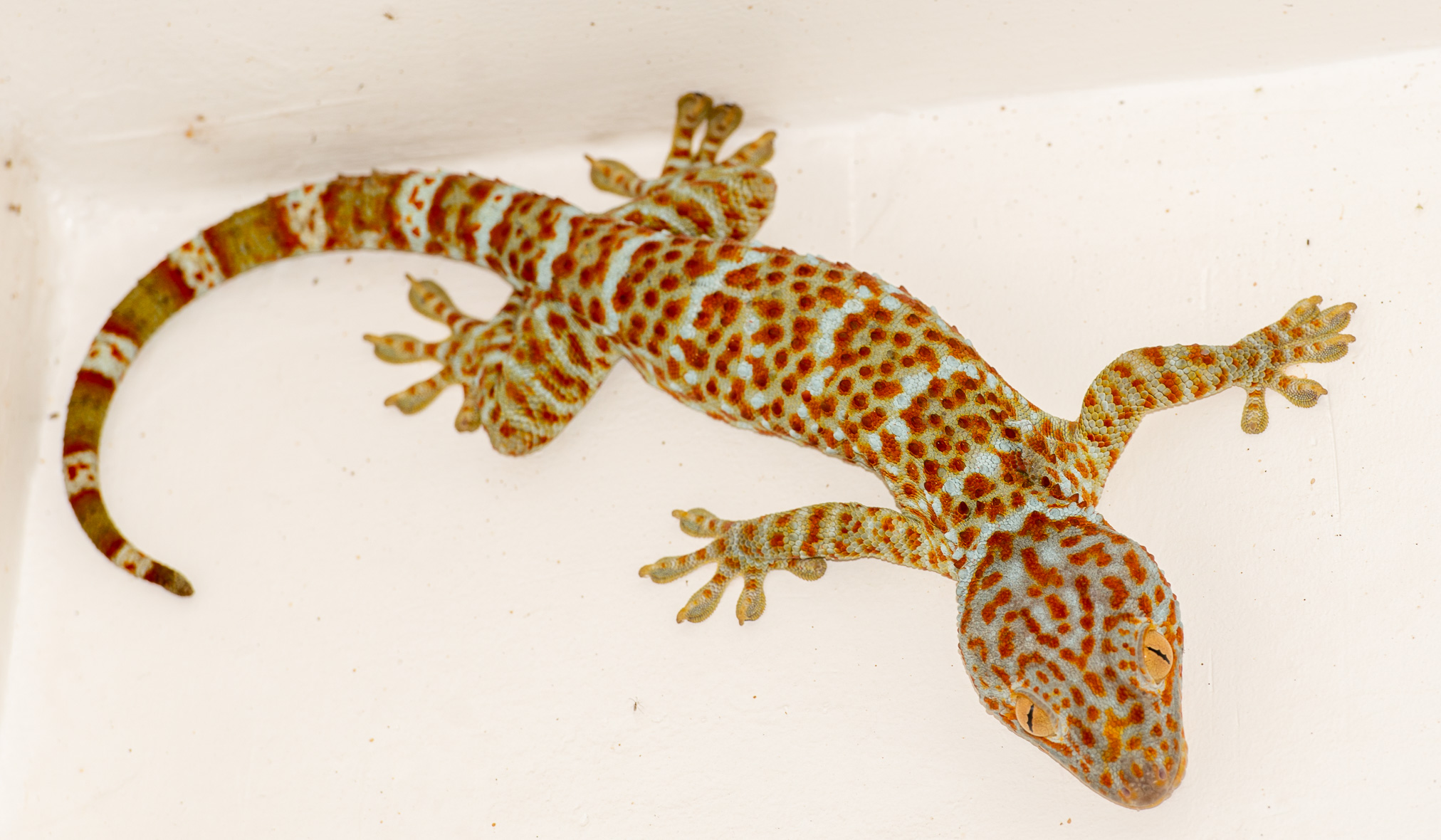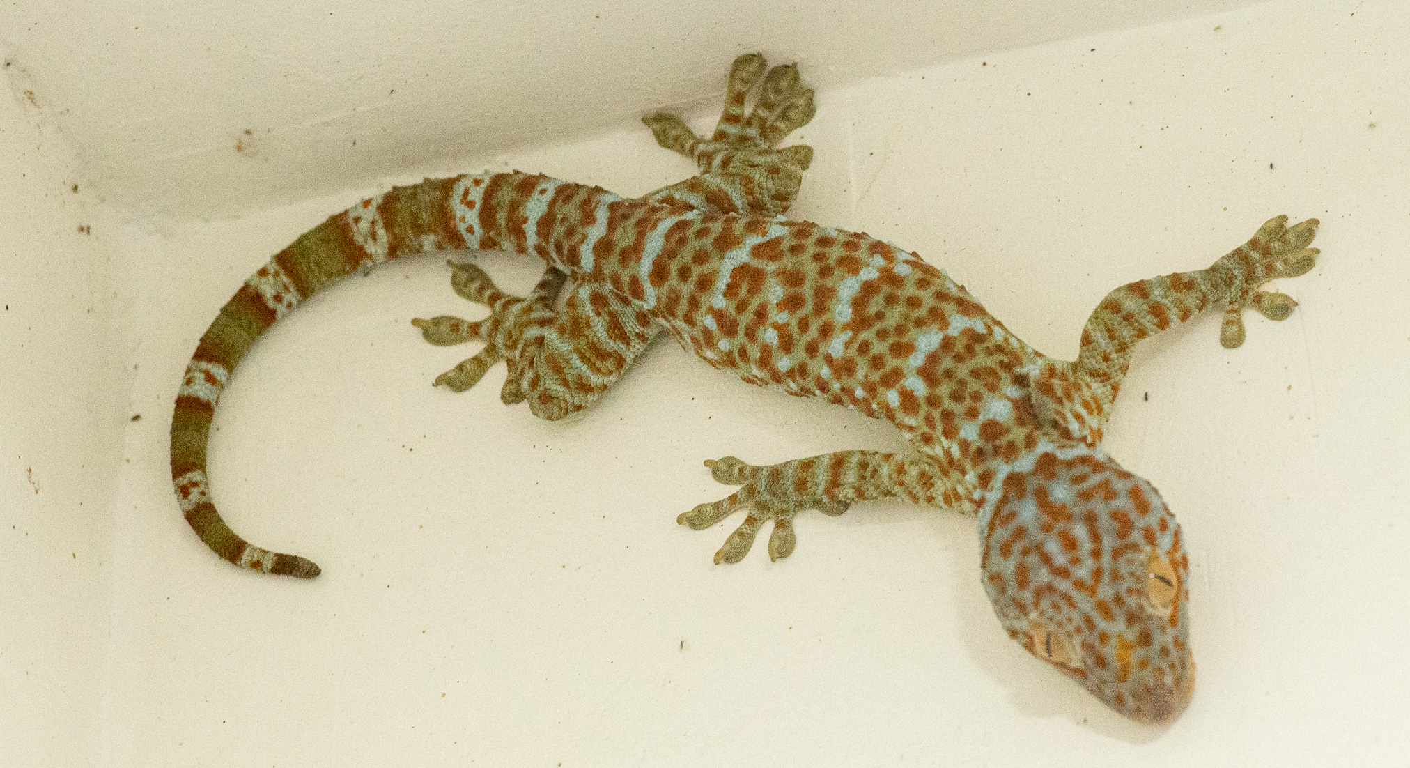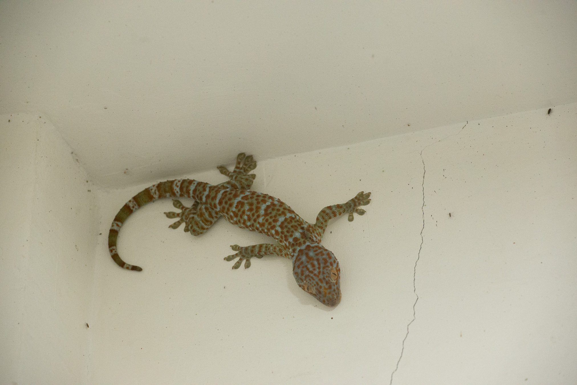 Dann ging sie raus und plötzlich ein lauter spitzer Schrei, direkt oben in dem kleinen Durchgang von der Küche zur Terrasse klebte ein großer Gekko an der Decke.