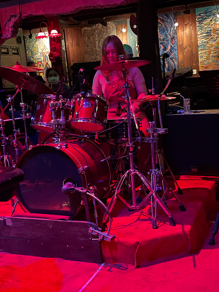 Danach ging es dann zu einem alten Lieblingslokal von mir, dem Saxophone Club, einer der angesagtesten Clubs in Bangkok. Donnerstags spielt da immer eine Big Band, auch heute. Man war das erfrischend nach diesem Coronascheiß mal wieder richtig handgemachte Musik zu hören! Und die Band weiss wie es geht! Allerdings wenig Jazz, eher Popsongs, Stievie Wonder u.ä. aber sensationell gespielt. Besonders beeindruckt hat mir die Dame, bzw. Wallküre am Schlagzeug, die hat Oberarme wie ich Oberschenkel…