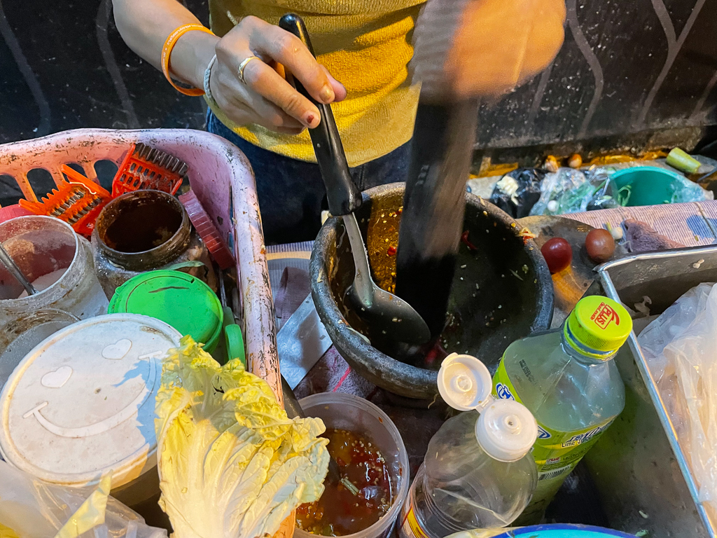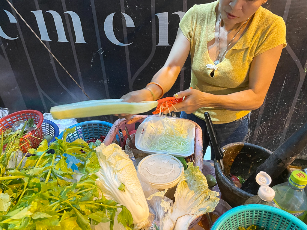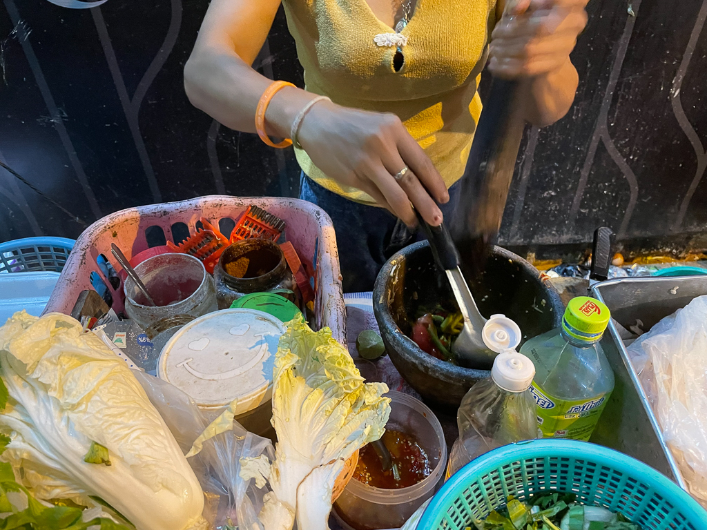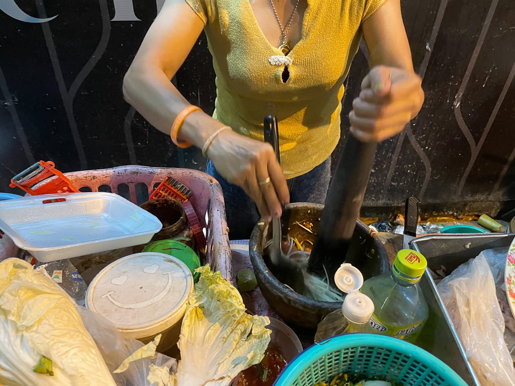 Sie hat mir noch einen Som Tam zubereitet, ein Papaya Salat, der höllisch scharf sein kann. Man sieht auf den Bildern die einzelnen Schritte der Herstellung.