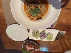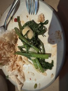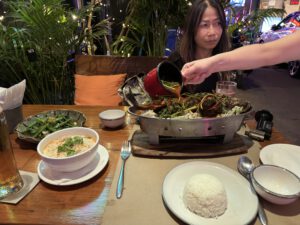 Dann zu Nui zur Massage und ich habe sie zum Essen ausgeführt. Himmlisch, gebratener Fisch mit Tomatensauce, Chinese Morning Glory mit Knoblauch, diese großen weißen Stücke, das ist Knoblauch, endlich mal genug Knoblauch! Dazu noch Tom Kha Gai, Hühensuppe mit Koskosmilch.