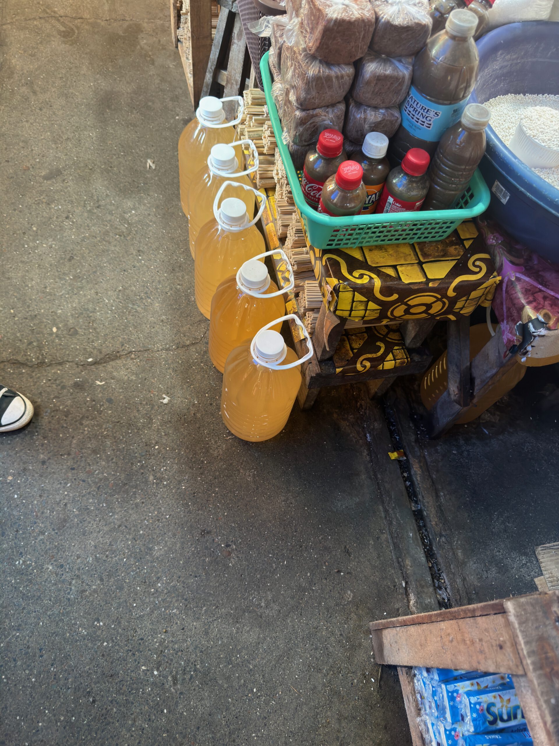Auf einem Bild sieht man größere Plastikflaschen auf dem Boden stehen. Das ist Palm Essig, hier auch „Tuba“ genannt.